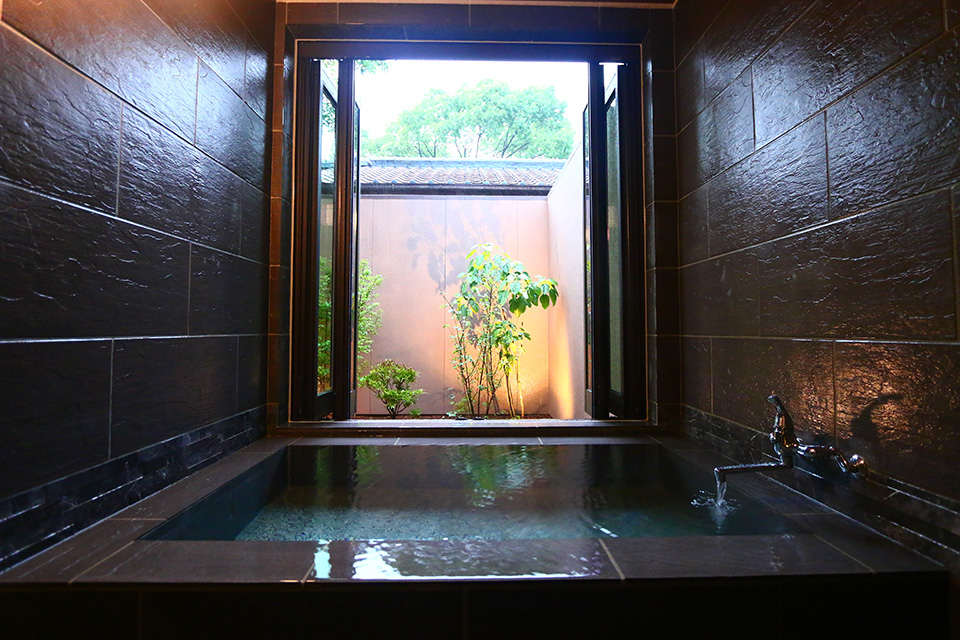 お部屋、内風呂からはそれぞれにプライベートガーデンを眺めることができ、 モダンでありながら和を感じさせる造りになっております。